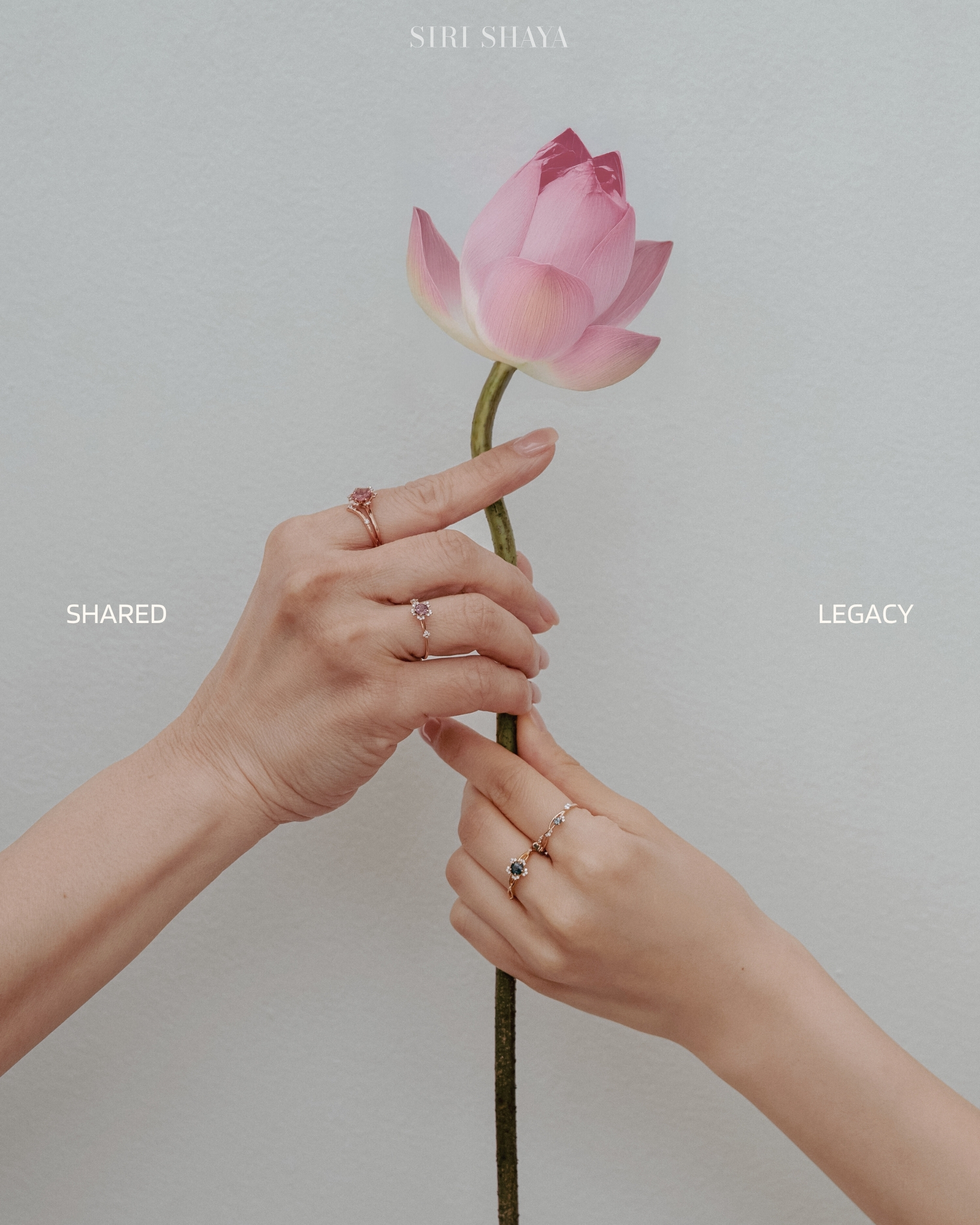 Rooted in Bloom draws inspiration from the lotus in Thai belief — a symbol of purity and origin. Though each bloom unfolds in its own time, they remain connected by the same unseen stem, carrying the quiet strength of love, family, and blessing. The collection reflects these invisible bonds between generations and the people who shape our lives.
